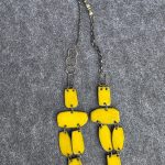 The yellow necklace was my first success after several experiments with firing temps, soak times, all completely different than for silver, copper or gold. This piece was inspired by peeling yellow paint on rusty grids surrounding