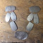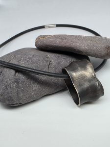 To the right the necklace shows deliberate iron break through, a property of steel which I’ve ‘explored further with controlled rusting then sealed with a clear acrylic. This necklace was inspired by rusting machine parts found