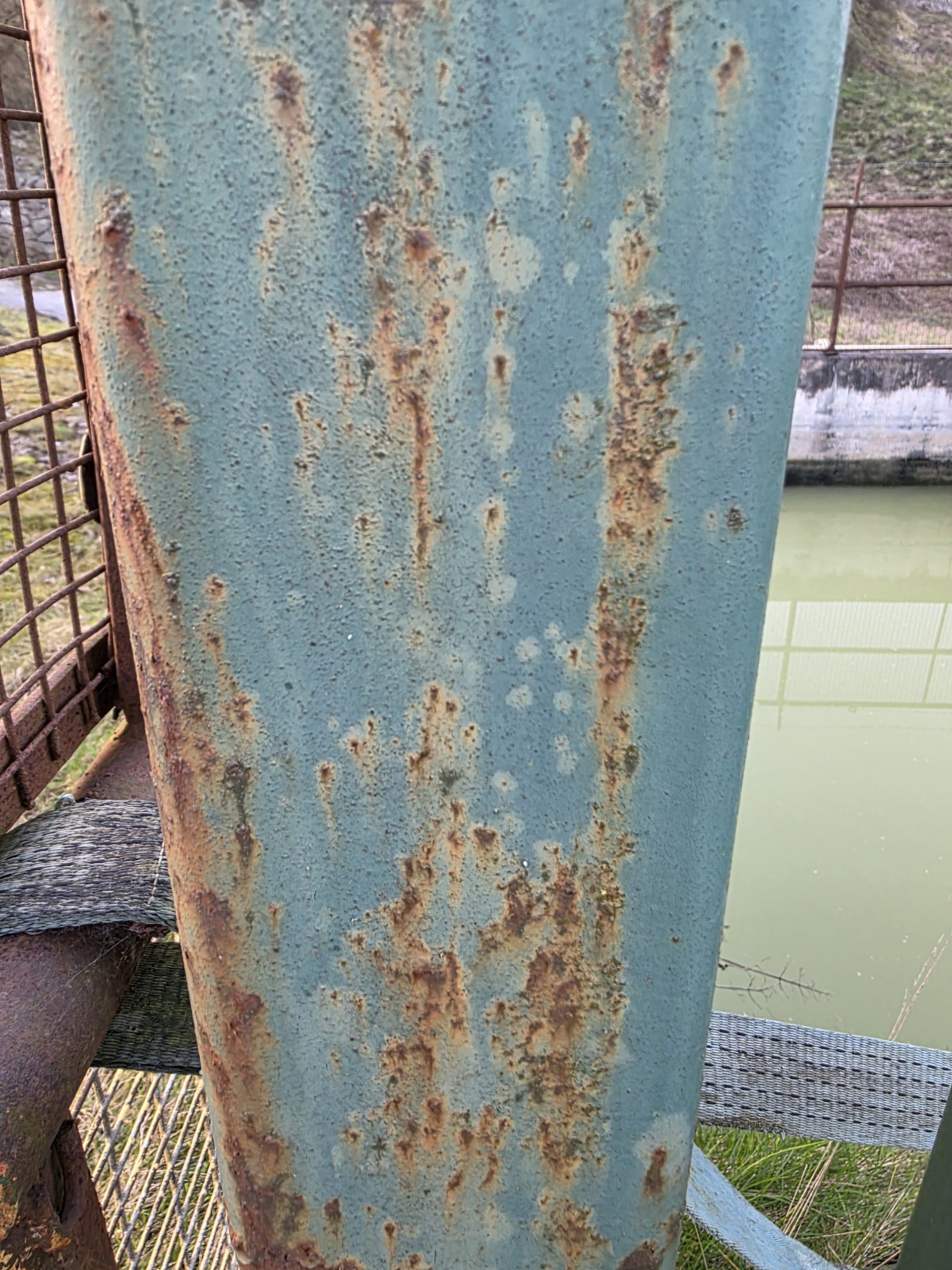 - peeling blue paint on rusty barrier around water tank Dene Quarry